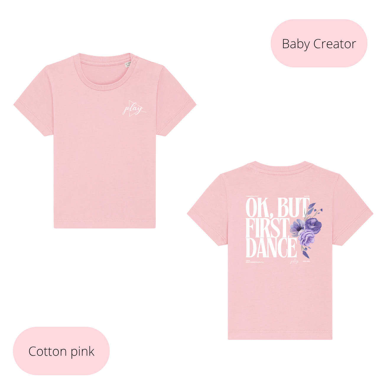 Edessä pieni Play logo, takana ´Ok, but first, dance´ teksti.
