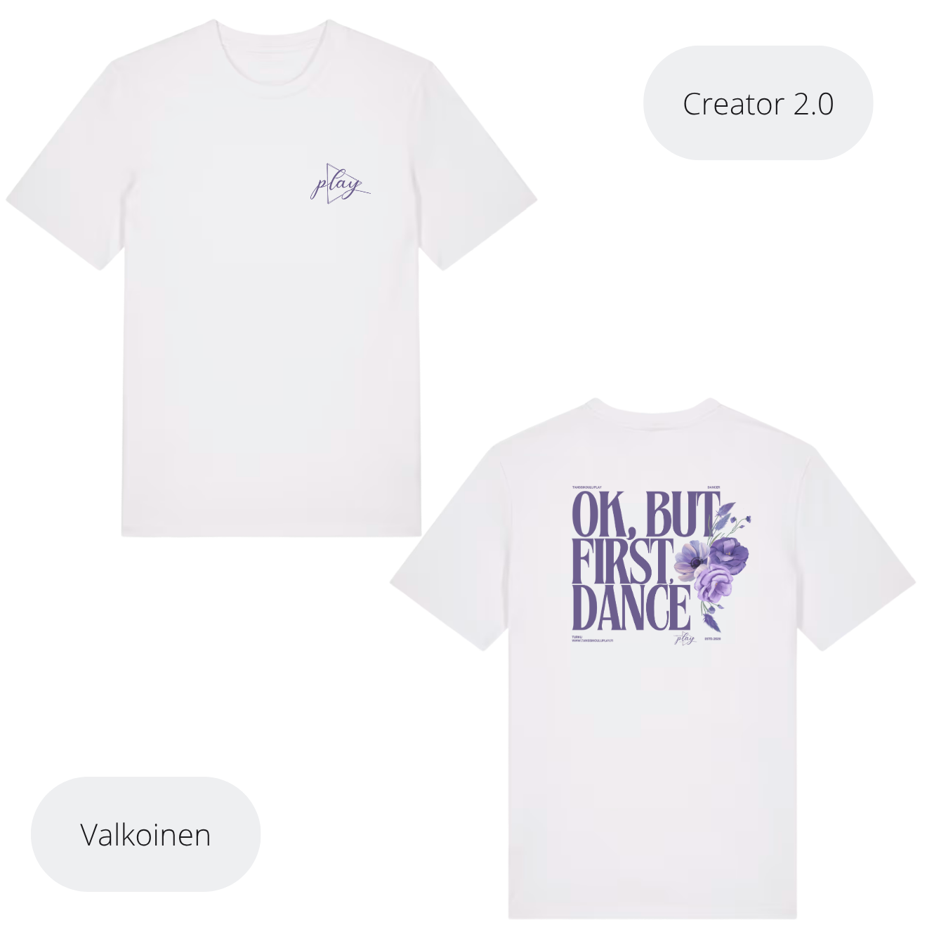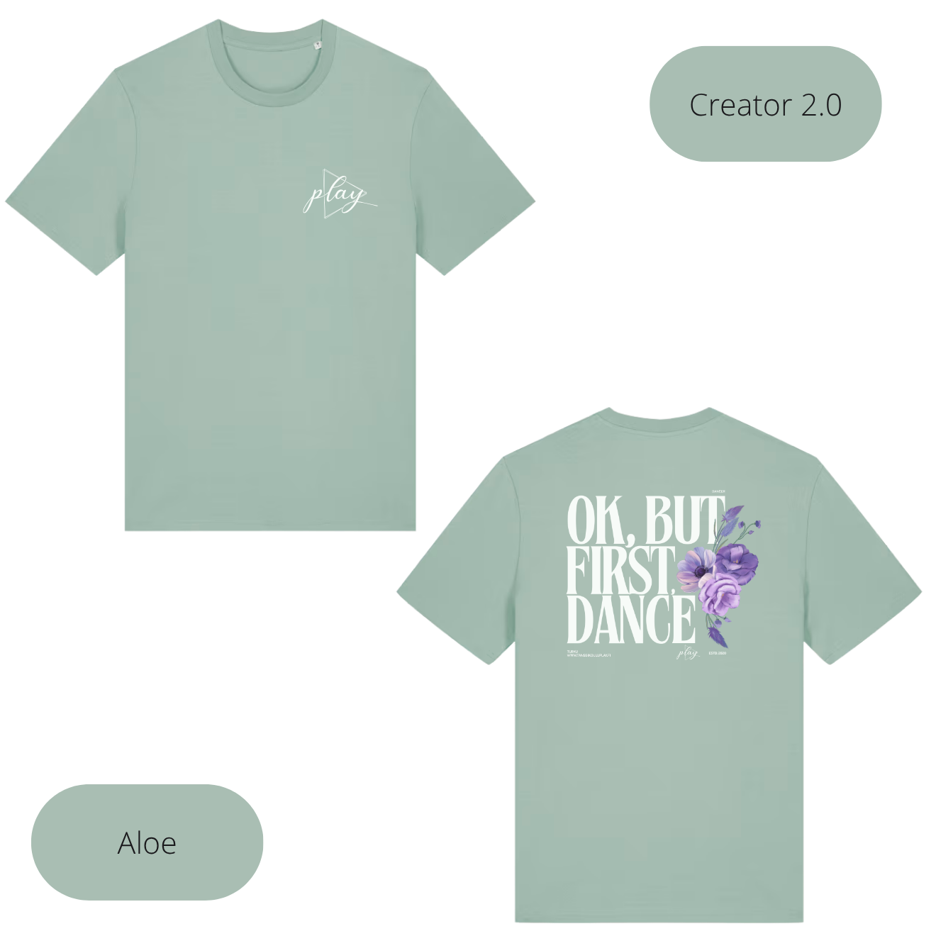 Pieni play logo edessä ja selässä Ok, but first, dance teksti.